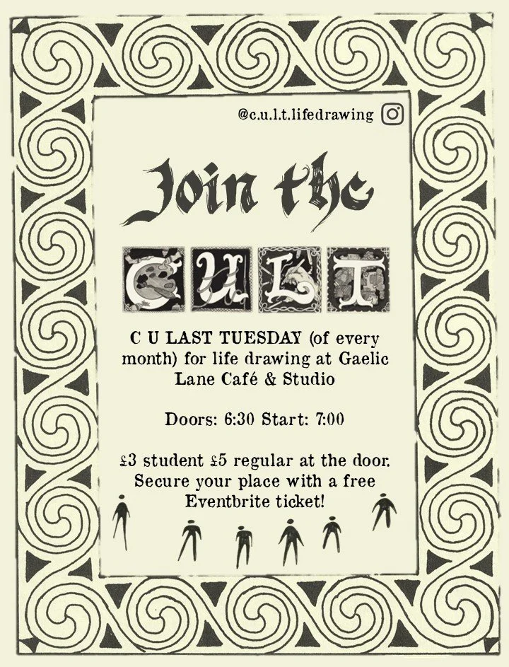 Vanessa: By accident. Growing Pains kindly offered their space to Gallowgate Life Drawing. Lucy and I volunteered to lead it when they were sick and we enjoyed it. This was Lucy's first ever life drawing class and I showed her the ropes of life drawing. Then speaking with Gallowgate, we kind of took on the role and were able to rebrand as CULT. CULT stands for C U Last Tuesday, as we host events on the last Tuesday of every month, a pun on C U Next Tuesday (the name idea came from Vanessa’s partner). We play with the idea of cults and call people who attend our sessions ‘cultists’, as an early quote from Lucy during the setup stages states: “Because what else would you call a group of people sitting around a naked person?” From there, the name stuck. Gallowgate life drawing was one of the most well-known life drawing classes in Aberdeen, but the original venue (the Blue Lamp) closed down, and the original organiser also felt it didn’t fit with her life anymore.